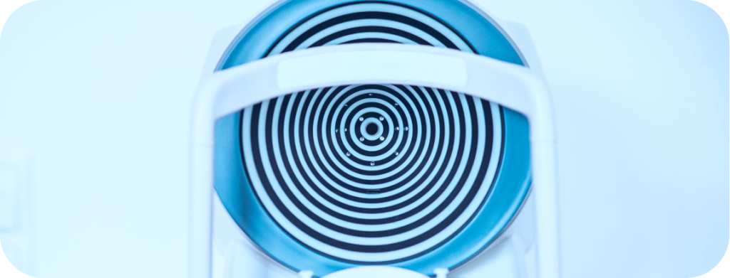 L’esame si svolge con il paziente posizionato comodamente, mento e fronte appoggiati su un supporto, mentre fissa una luce centrale circondata da anelli luminosi.